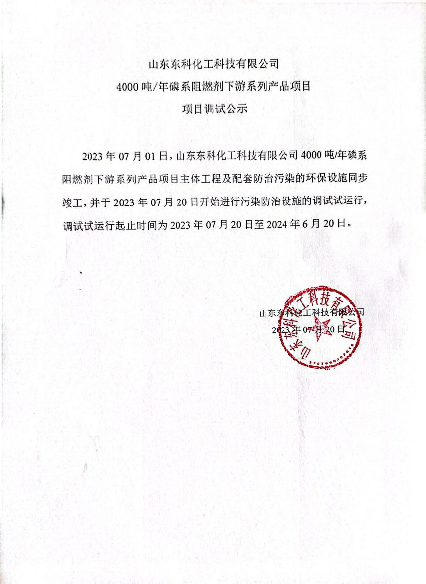 山东东科化工科技有限公司4000 吨/年磷系阻燃剂下游系列产品项目调试公示